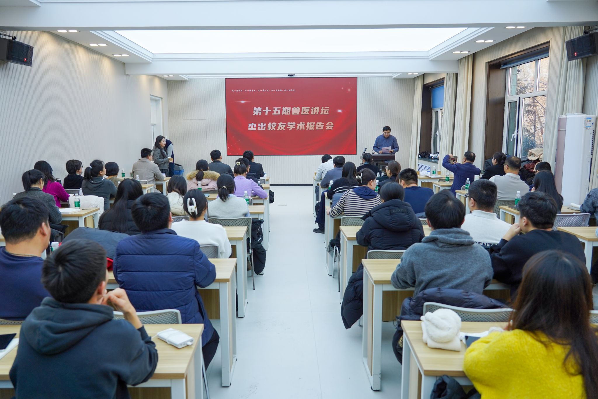 李金龙代表学院对杰出校友多年来对学校、学院发展的关心和支持表示感谢。他指出,学院自2020年举办兽医讲坛,致力于拓宽学生视野,加深行业了解,帮助学生成长成才;校友是学院最宝贵的资源和财富,为学院事业发展贡献了才智和力量;讲坛旨在充分发挥校友榜样示范作用,为师生搭建交流思想、互动沟通的平台,希望学院师生以此次讲坛为契机,向榜样学习、向优秀看齐,为兽医学科建设贡献力量。