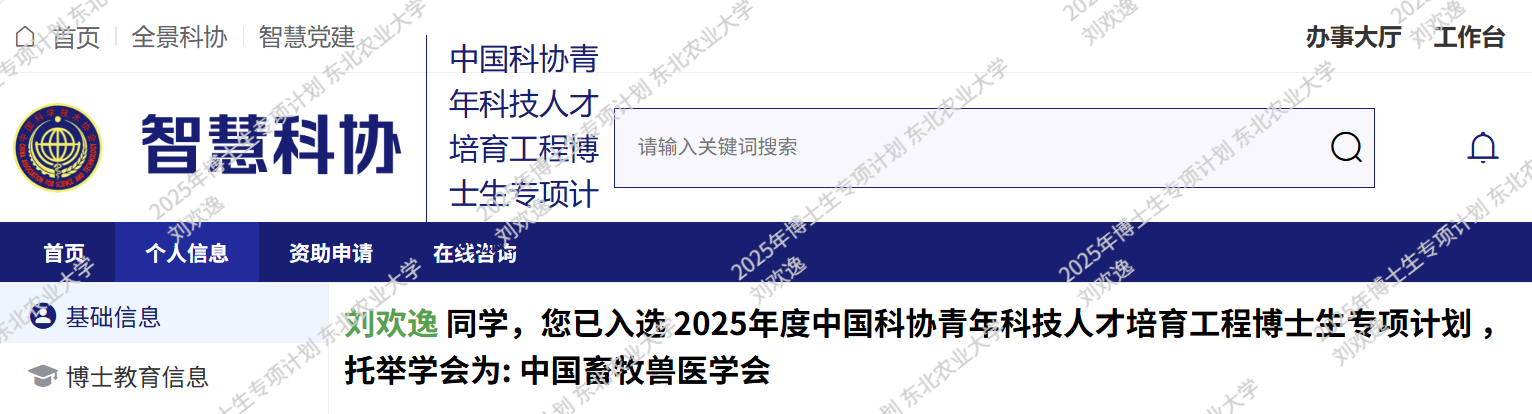根据《中国科协青年人才托举工程博士生专项计划管理办法(试行)》《黑龙江省科协关于开展2025年中国科协青年科技人才培育工程博士生专项计划推荐工作的通知》相关要求,中国科协于2025年11月组织实施了中国科协青年人才托举工程博士生专项计划。经过严格评选,我校伟德betvlctor19462024级动物药学博士研究生刘欢逸同学成功入选该计划。